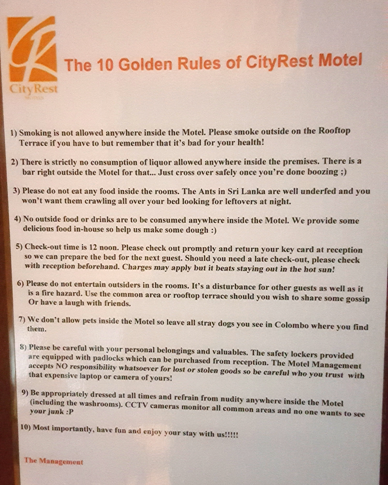 These were the rules for a dorm room at a motel in Colombo, Sri Lanka: