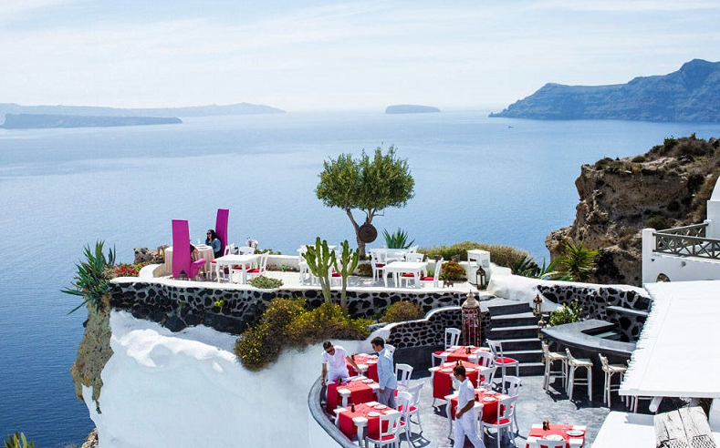 Morning: Wake up in your cliffside villa at Canaves Oia Suites and enjoy a breakfast with panoramic views of the Aegean Sea.
